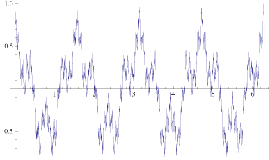 \[ f(x) = \sum_{n=1}^\infty \dfrac{1}{2^n}\cos(4^n x). \]The following diagram, created using Mathematica, gives the graph of \(y = \sum\limits_{n=1}^{50} \frac{1}{2^n}\cos(4^n x)\) for \(0\leq x\leq 2\pi\).