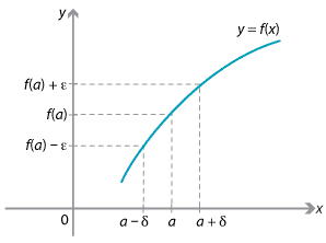 The definition states: Given \(\varepsilon > 0\), there is a positive real number \(\delta\) such that, if \(|x-a|<\delta\), then \(|f(x)-f(a)| < \varepsilon\).