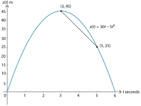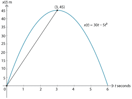 \[ \dfrac{x(3)-x(0)}{3-0} = \dfrac{45}{3} = 15 \text{ m/s}. \]This can be illustrated on the position–time graph by the chord from the origin to the point \((3,45)\). The gradient of this chord is 15.