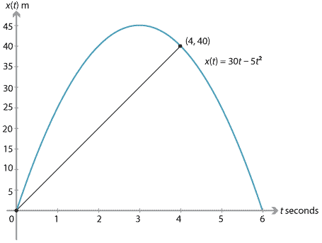 \[ \dfrac{x(4)-x(0)}{4-0} = \dfrac{40}{4} = 10 \text{ m/s}. \]This can be illustrated by the chord from the origin to the point \((4,40)\). This chord has gradient 10.