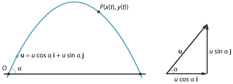 \[ \dot{\mathbf r}(t) = u\cos\alpha\,\mathbf{i} + (u\sin\alpha - gt)\,\mathbf{j}. \]Integrating again with respect to \(t\) gives
