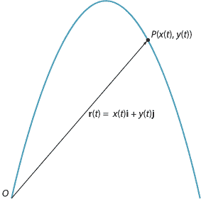 \[ \mathbf{r}(t) = x(t)\,\mathbf{i} + y(t)\,\mathbf{j}. \]Here \(x(t)\) is a function of \(t\) describing the position of the particle in the \(\mathbf{i}\)-direction, and \(y(t)\) is a function of \(t\) describing the position of the particle in the \(\mathbf{j}\)-direction. Assume the particle starts its motion from the origin.