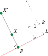 Again we have a plane transformation, which stretches the plane out from $L$ by a factor of $k$. Note that if $k$ is positive, then $X'$ lies on the same side of $L$ as $X$; if $k$ is negative, then $X'$ lies on the opposite side of $L$ from $X$.