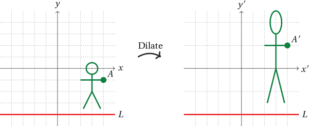 Given a line $L$ and a real number $k$, we can dilate points from $L$ by a factor $k$. From a point $X$ not on $L$, once more we draw the perpendicular from $X$ to $L$. The dilation $X'$ of $X$ from $L$ with factor $k$ is the point $X'$ on the perpendicular which is $k$ times as far away from $L$ as $X$ is. In other words, if $P$ is the foot of the perpendicular from $X$ to $L$, then $\overrightarrow{PX'} = k \; \overrightarrow{PX}$.