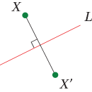 To find $X'$, we can draw the line perpendicular to $L$ through $X$; $X'$ is the point on this perpendicular, on the other side of $L$, at the same distance from $L$ as $X$.